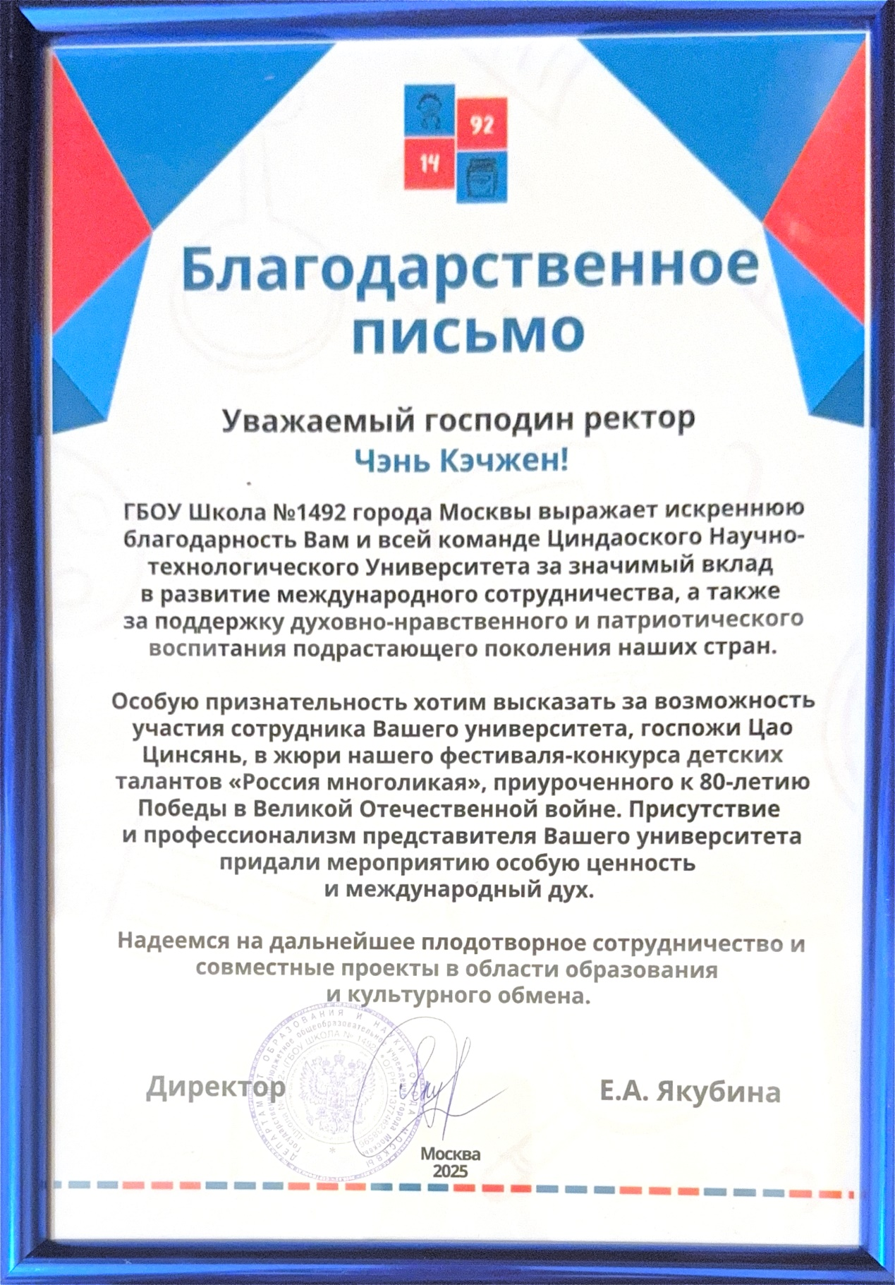 近日,学校收到来自俄罗斯莫斯科市第1492中学的感谢信,信中写道:“谨向青岛科技大学为促进国际合作发展以及支持中俄两国青少年精神道德与爱国主义教育所作出的重要贡献表示衷心的感谢。我们期待未来在教育与文化交流领域开展更多富有成果的合作与联合项目。”