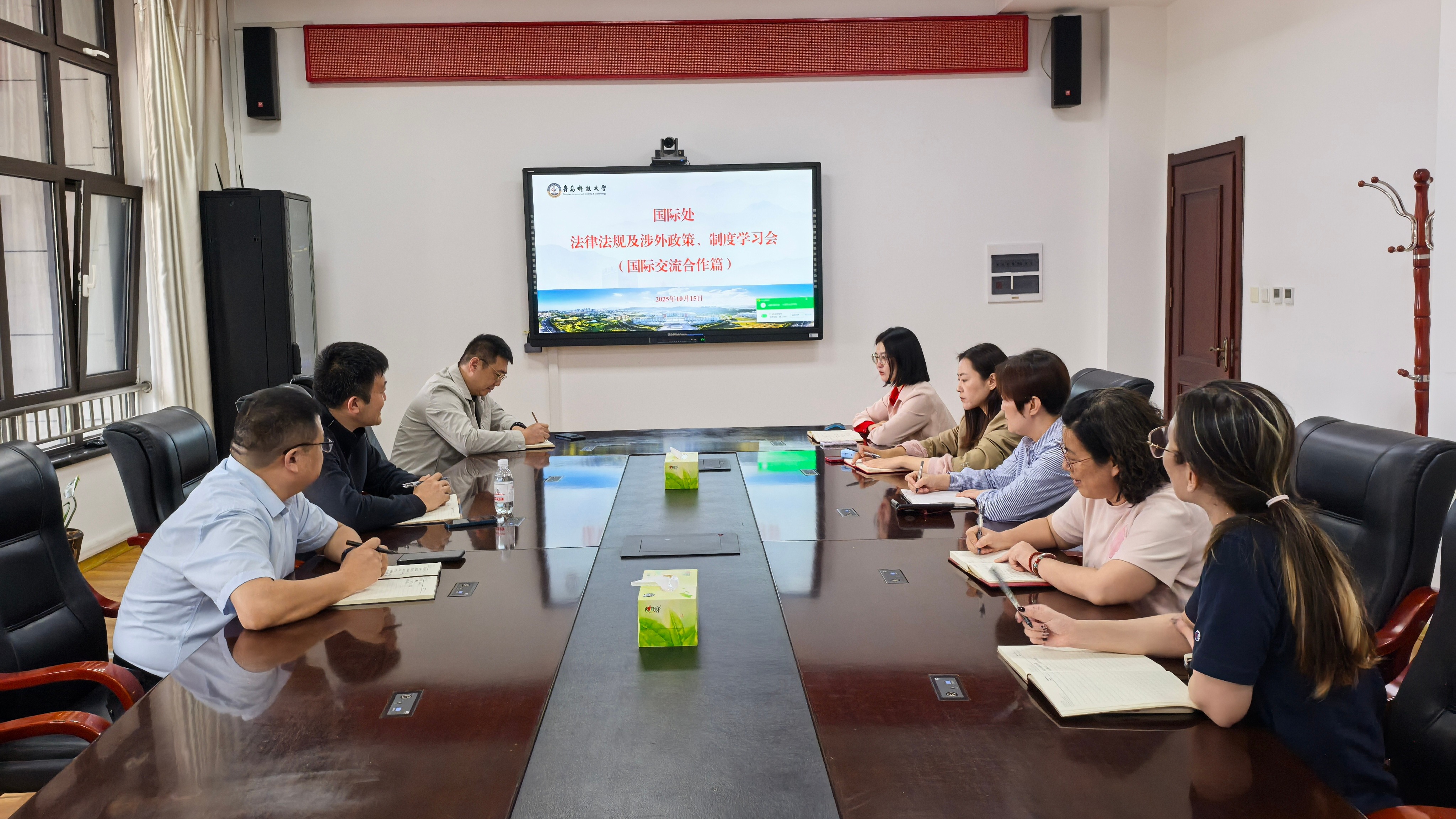 10月15日下午,国际处在综合服务楼2015会议室召开法律法规及涉外政策、制度学习会(国际交流合作篇)。国际处全体工作人员参加会议。