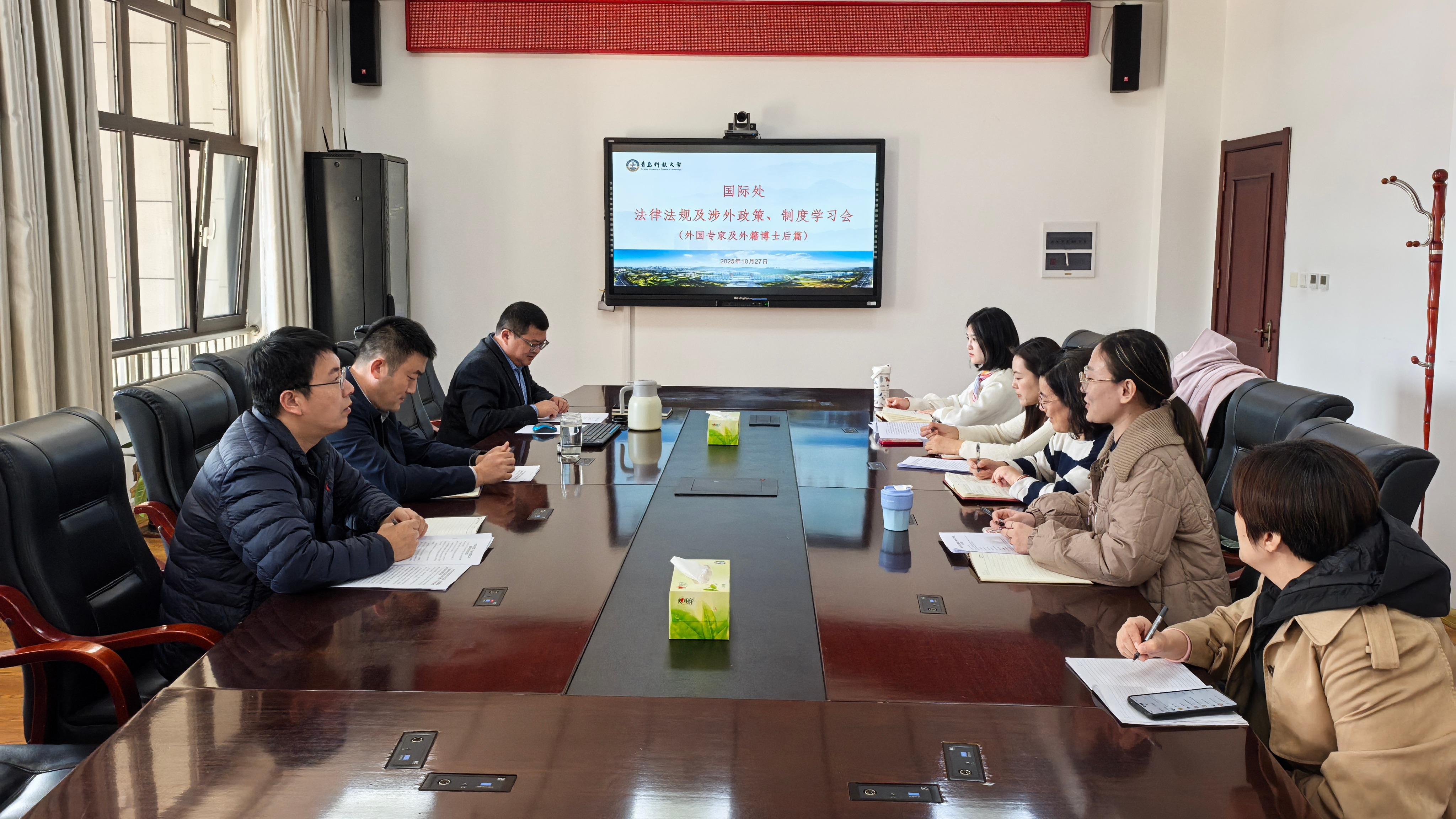 10月27日下午,国际处在综合服务楼2015会议室召开法律法规及涉外政策、制度学习会(外籍专家来华篇)。国际处全体工作人员参加会议。